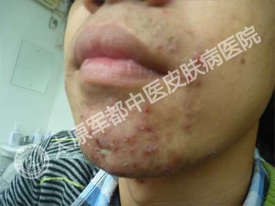 【病种与症状】痤疮。该患者主要集中发于下颌部,皮损处密布炎性丘疹、脓包、囊肿、结节。脓包破溃处有的结痂,有的渗出液结晶,有的留下痘印。