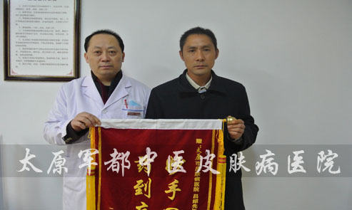 11月12日,在观察近两周,女儿的病情仍没有反复现象,全家人为之欣喜不已,于是顾不上女儿上课,邓父手捧“妙手回春,药到病除”的感谢锦旗不远千里来到太原肤康中医皮肤病医院,赠与主治医师吕绍先。