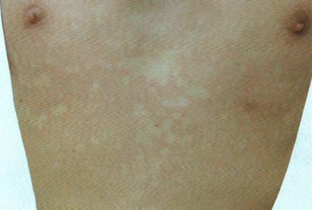 3、细碎棕色鳞屑斑。汗斑出现后,皮损常常是细碎棕色鳞屑斑,同时鳞屑的厚薄程度,往往会带来皮肤颜色的改变。时间较久的呈浅色斑。皮疹无炎性反应偶有轻度瘙痒感。皮损易发生于胸背部,也可累及颈、面、腋、腹、肩及上臂等部位。