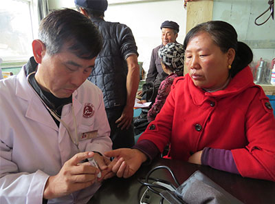 有的村民白天不在家,肤康医疗队只能夜间探访,由于贫困,村民家房顶有些漏水,导致电灯电路损坏,志愿者用手电筒照明,为村民进行健康筛查。